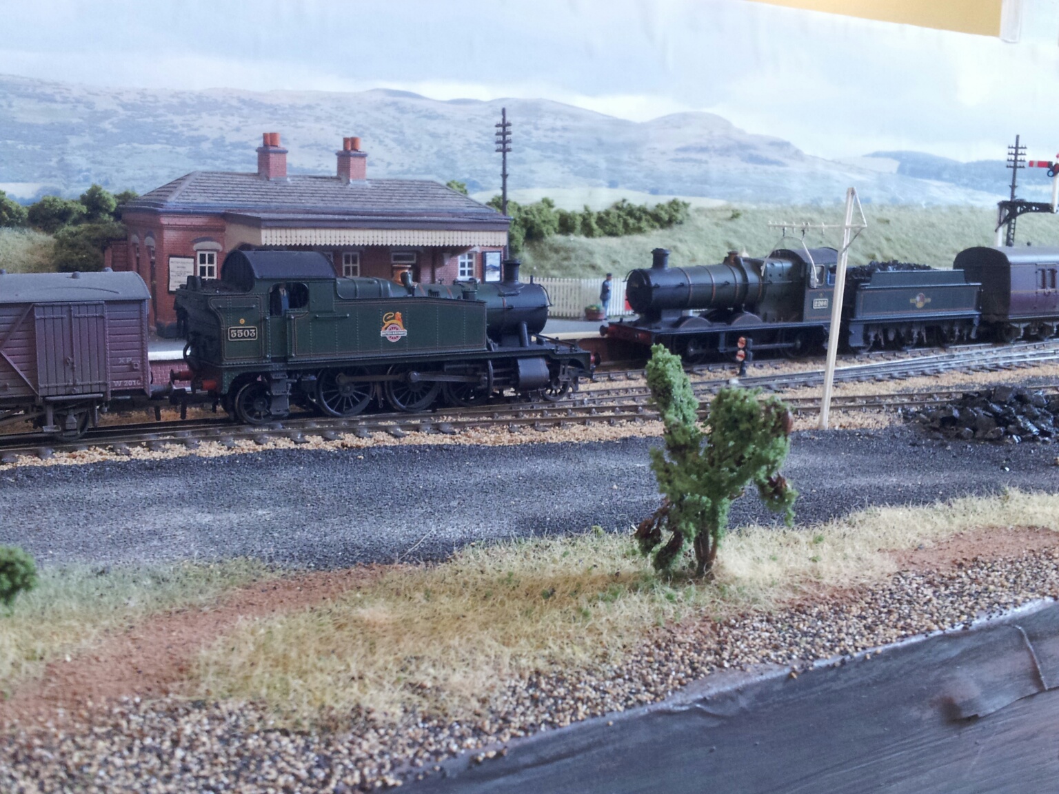 Construction Details The boards are 6mm ply on a 2 x 1 frame. Wiring is for DCC though with isolating switches so it can be used as DC. The track is SMP with hand built points, all of which are operated by wire-in-tube with toggle switches for polarity changing. The contours are shaped polystyrene with a craft paper and PVA coating. Scenery is a combination of all sorts I had to hand and picked up at exhibitions but the dirt is an exact match to the soil around the Kilve area. I know that, because that's what it is. On one visit I scooped up a cup full of soil and on return home sieved and dried it. It makes it look local and best of all, it's free. | |