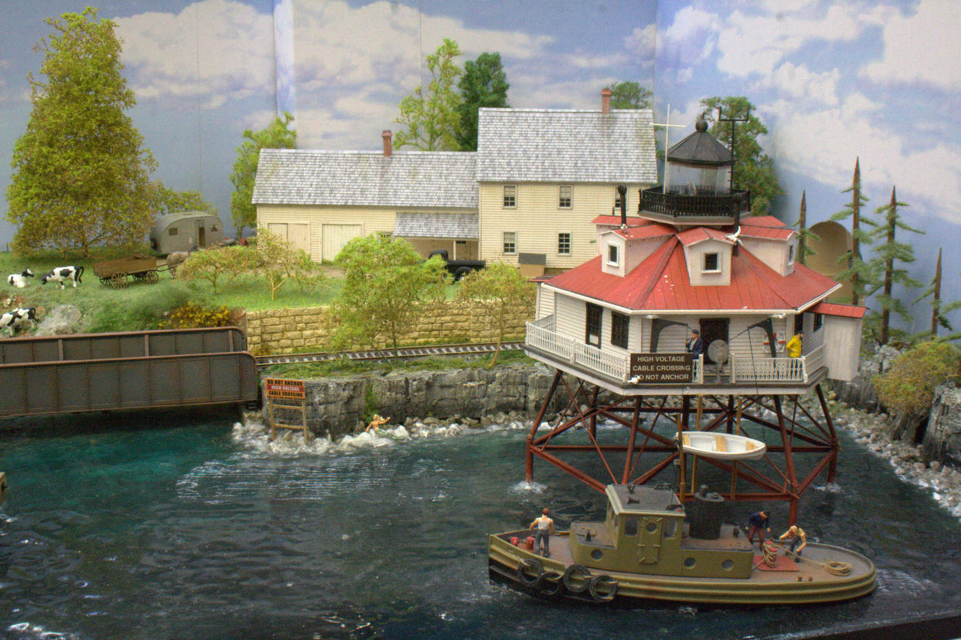 Red Hook Bay is a fictitious busy seaport on the coast of Maine, USA. Besides the local fishing industry, Red Hook Bay is host to a brewery and a dairy. The town is a major transportation hub for the coastal islands off the coast of Maine and has ferry services from the wharf for both passengers and cars. The town is also a railroad junction for the Boston & Maine and Maine Central railroads. It is also served by a local tram service with a tram stop in front of Hokum’s Burlesque Theatre and the Topless Bar on Main Street. Set in the late steam/early diesel era of the late 1940’s. It is somewhere close to Route 1, which links Portland and Rockland in Maine. The thirty structures include craftsmen kits from a wide variety of American specialist companies. The busy seaport has several boats including a sternwheeler. The structures have been deliberately constructed to look a little worse for wear. The majority of the buildings are “limited-edition” craftsmen kits. The lighthouse is a replica of the Thomas Point Light located off the coast of Maryland but is similar to lighthouses that can be found in New England. The farm features a typical New England style farmhouse with connected barn. Where you find sailors you will find bars and other establishments catering to their interests. Publications: November 2014 edition of Continental Modeller. Also was featured in CM’s North American 2014 Autumn Special as “Red Hook Bay – The Build”. French publication “Loco-Revue” Apr 2017 and Spanish publication “Maquetren” Nov 2016. BEST IN SHOW – the layout has been awarded BIS at 2016 Gaugemaster Weekend, Folkestone, Poole, Letchworth, Silver Fox Milton Keynes, Best Scenic Layout award at Erith plus 2nd Prix de Public, Montelimar, France. |