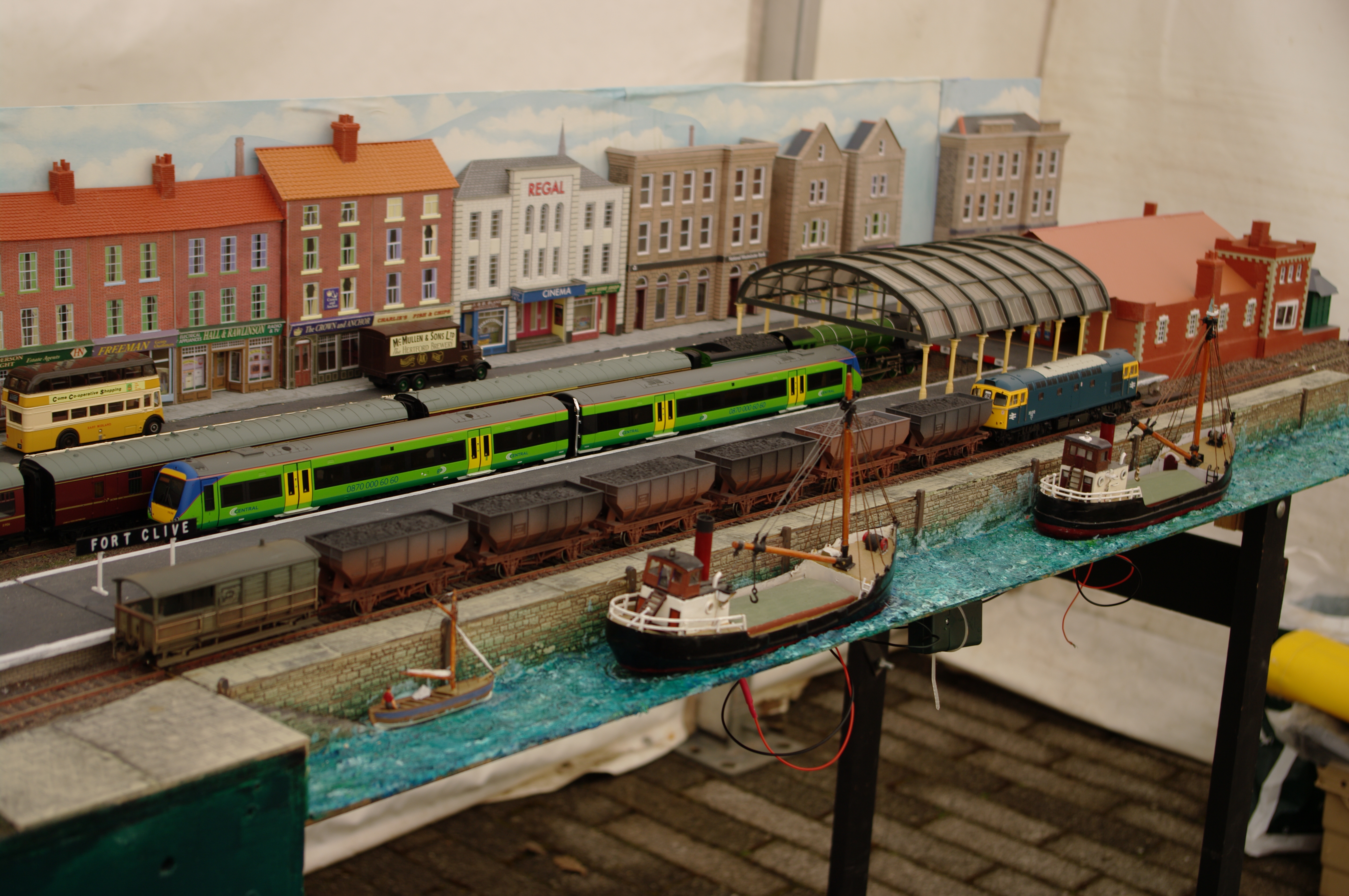 quayside. Although originally built as a Scottish loch side steam branch for passenger and local goods, it can be shown as any location between the years 1955 and 2015 by dressing with appropriate road vehicles and rolling stock. The layout is just as comfortable with snowy Christmas themed parcel carrying steam trains to colourful private owner DMUs, even both at the same time depending on the show. It travels in 2 cars with 4 operators for most shows. Distillery Branch has been the 'go to' layout for the club over the years making regular appearances at Dunster to support the 'Dunster by Candelight' celebrations as well as making several visits to West Somerset Railway events. | ![]() |