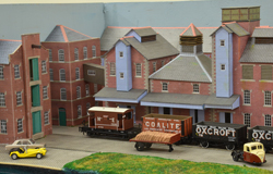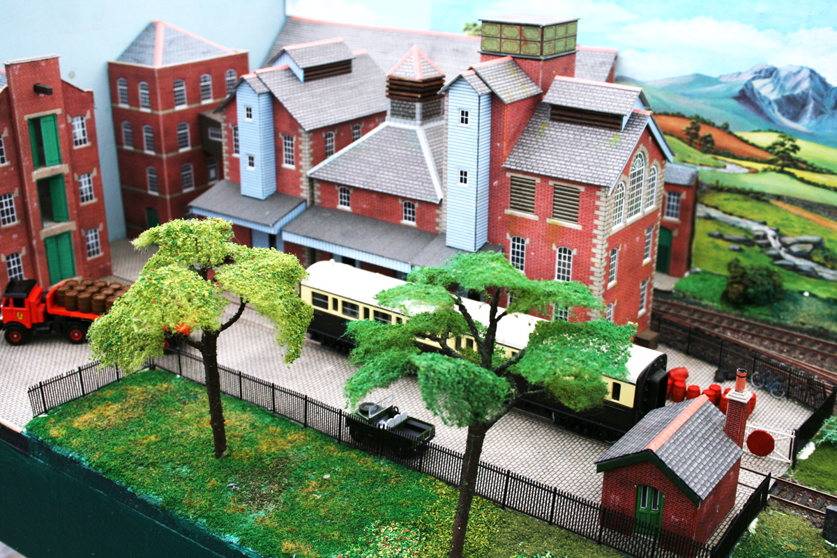 shops behind, then some cottages, leading to an industrial area showing a garage and bus depot. The station which has three platforms has been recently renamed 'Gurrside' in honour of our late Chairman. One of the platforms serves as a standard platform as well as providing access to the quayside for loading and unloading boats. The dock is surprisingly busy with two Clyde Puffers frequently moored alongside the quay. The track runs out of the station as a single line initially running through countryside over a level crossing to a short goods spur. The line then divides to a cattle dock and goods shed. It continues under a pedestrian bridge to a two road carriage siding in front of the main line. The nearest carriage siding also leads to the spur into the distillery yard loading bay. The distillery buildings act as a shield to obscure the entrance to the sector plate fiddle yard as the main line slides behind the factory structures. |