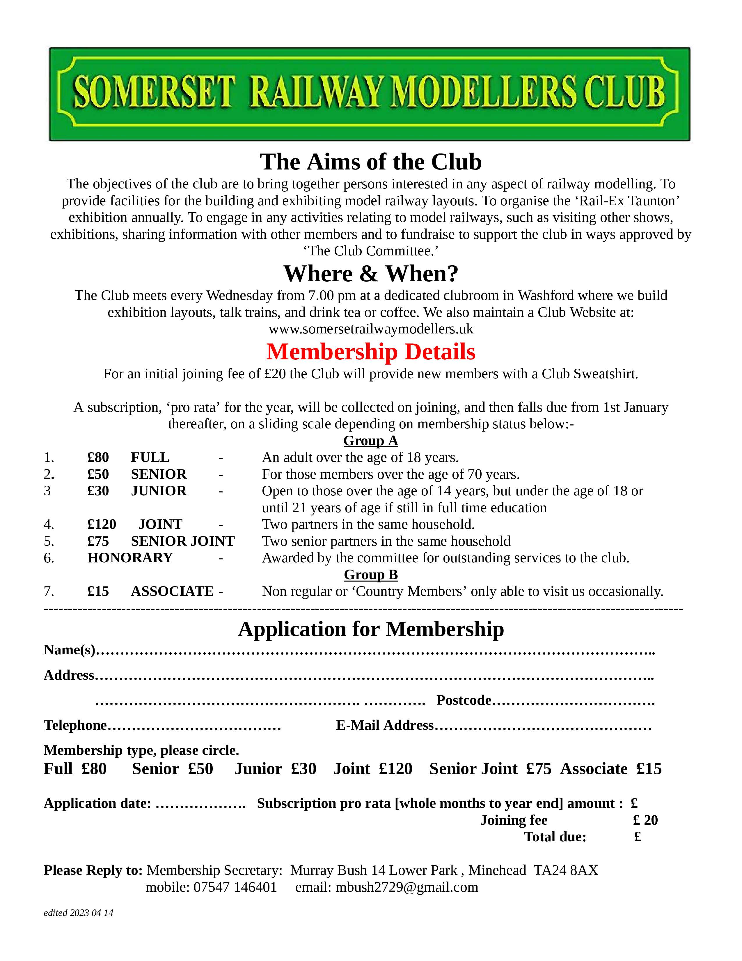 | All memberships run calendar year with discounts for Juniors and Seniors (70+) off our full Adult Membership. On joining the club, a small one off joining fee of £25 secures you a blue club shirt which can be worn when representing the club at various events/exhibitions such as the Rail-Ex Taunton show. Subscriptions may be paid in instalments (quarterly or monthly) by arrangement with the Treasurer.