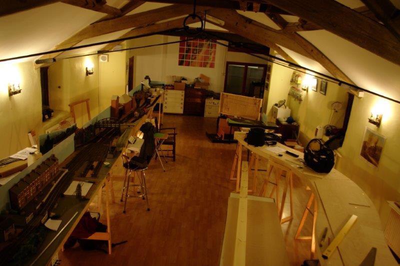 The clubrooms are composed of three rooms. The view on the left shows one of these rooms with Gorbriton Hill on the left hand side with the baseboards of Wavey Bridge nearing completion on the right. There is a similiar size room used for layout building and also a combined area which is partitioned into a tea toom and workshop area. |